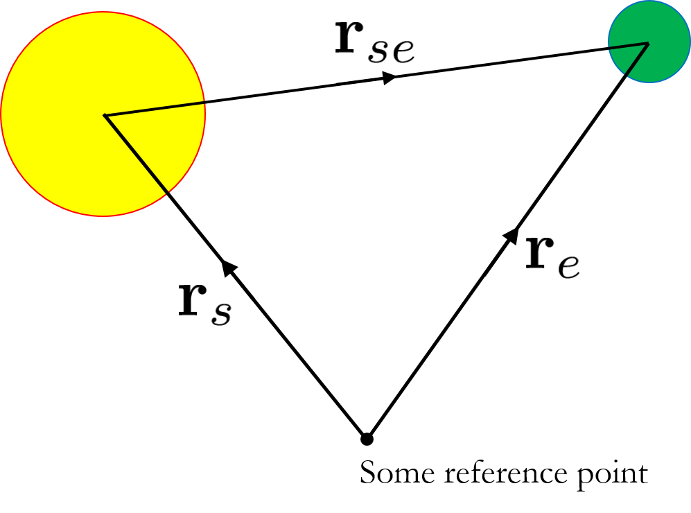 Let {\bf r}_{s} and {\bf r}_{e} be the position vectors of the Sun and Earth respectively. Express {\bf r}_{se} in terms of the two postition vectors.